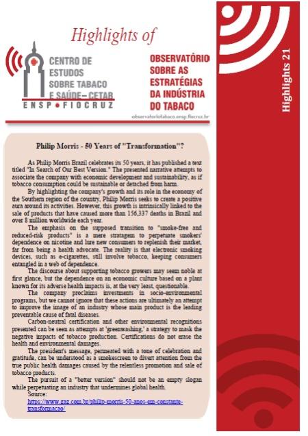 Highlights with topics considered important with the aim of promoting debates and decision-making in the field of tobacco control. In this edition, the agenda is about: Philip Morris - 50 Years of "Transformation"?; Postponement of COP10 and MOP3; Challenges in Tobacco Diversification; Demystifying the Tobacco Industry and Smoking ESG: The Tobacco Industry and the reality behind the Curtain.