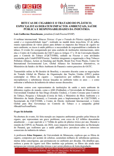 HASSELMANN, Luis Guilherme. Bitucas de cigarro e o tratado do plástico: especialistas debatem impactos ambientais, saúde pública e responsabilidades da indústria. Cetab/Ensp/Fiocruz, Rio de Janeiro, 23 jul. 2025. 3 p.