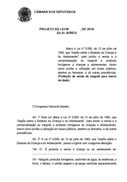 BRASIl. Câmara dos Deputados. Projeto de Lei n. 10074/2018. Estado do rio de Janeiro, 2018. Altera a Lei nº 8.069, de 13 de julho de 1990, que “dispõe sobre o Estatuto da Criança e do Adolescente”, para proibir a venda e a comercialização do narguilé e produtos fumígenos a crianças e adolescentes. Autor: Aureo Ribeiro, 18 abr. 2018. p. 1-4, 2018.