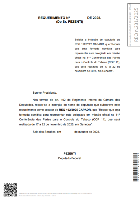 PEZENTI, Rafael; SPERAFICO, Dilceu. Req 231/2025 CAPADR. Câmara dos Deputados, Brasília, out. 2025. Disponível em: https://www.camara.leg.br/proposicoesWeb/prop_mostrarintegra?codteor=303.... Acesso em: 13 nov. 2025.